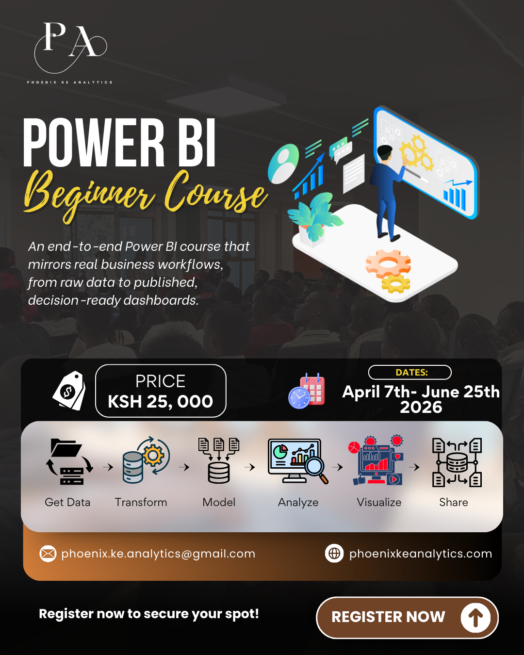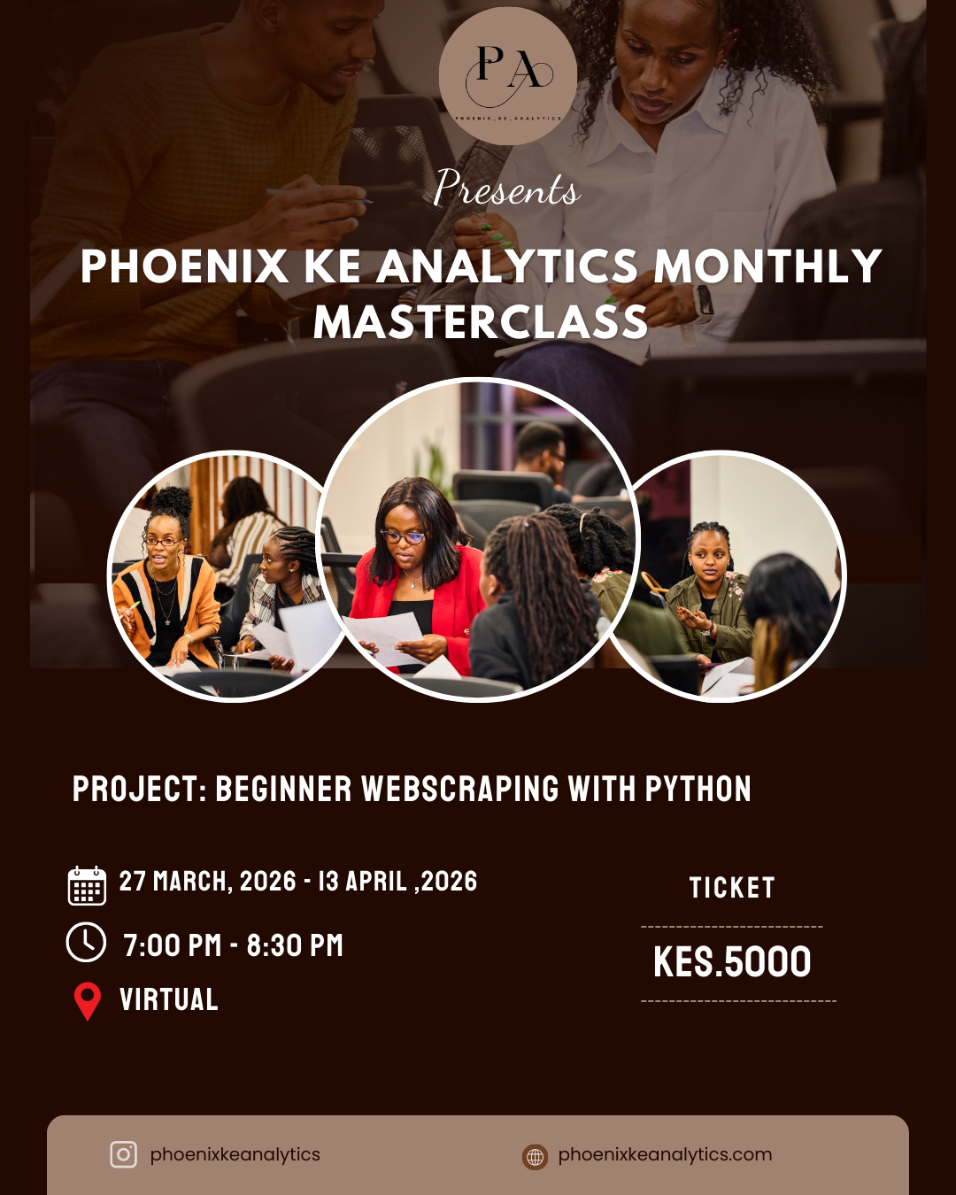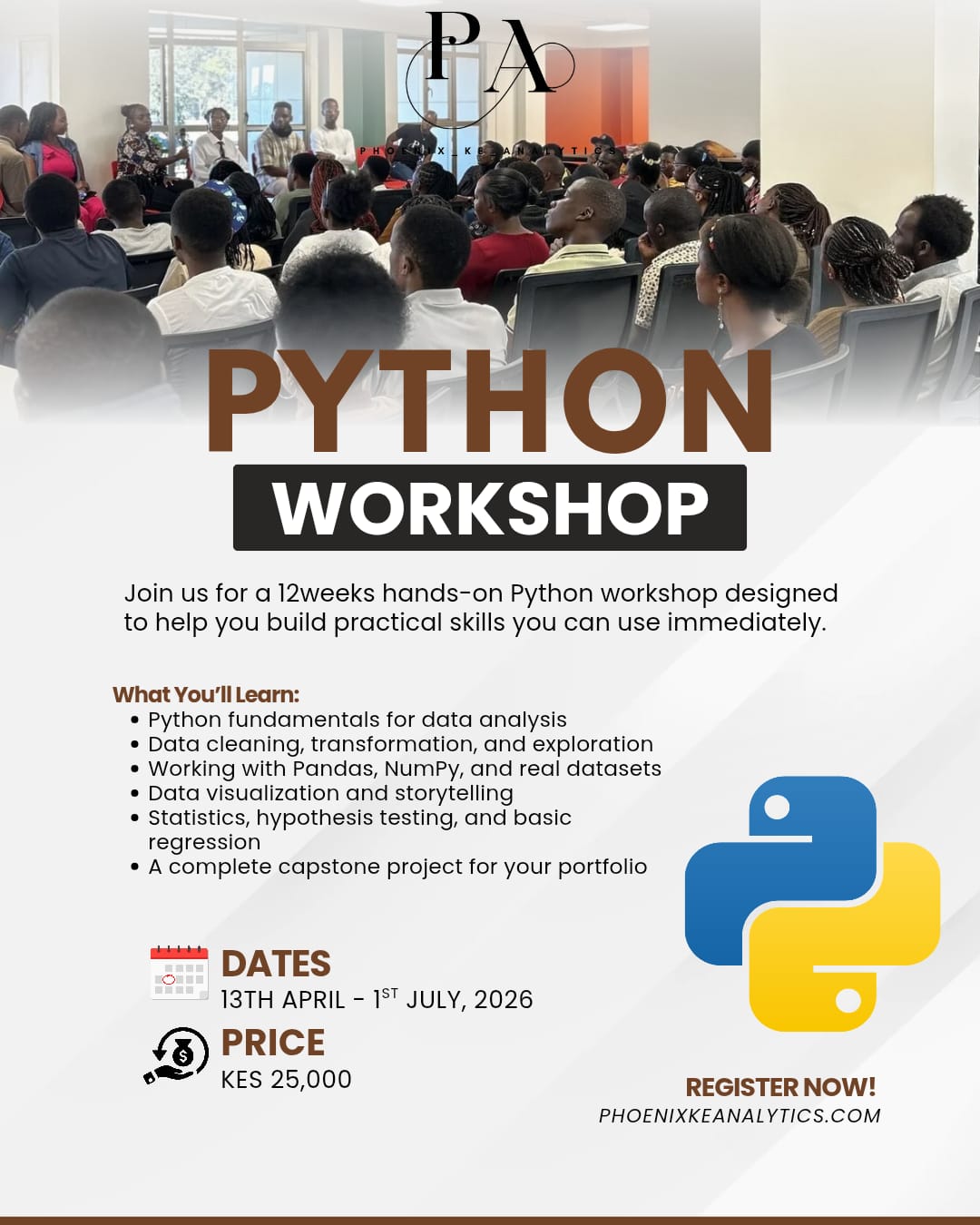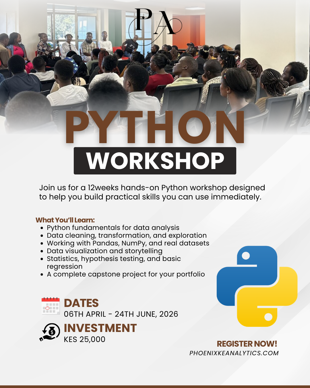 Phoenix KE Analytics is where Data and AI talent meets business needs. We develop skilled professionals through community-driven learning and mentorship, while partnering with organizations to solve their talent gaps, training needs, and analytics challenges.